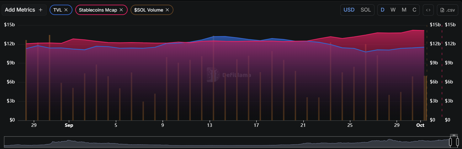 穩定幣供應量的暴增更是提供了一個關鍵訊號。過去 24 小時內,Solana 上的穩定幣總量增加了超過 3 億美元。