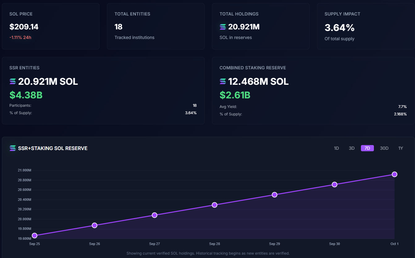 除此之外,18 個實體建立的 Solana 儲備總計持幣量達到 2092.1 萬枚 SOL,價值 43.7 億美元,其中約 1246.8 萬枚 SOL 被用於質押,佔這些實體總持倉的 59.6% 。這種長期鎖定供應量的行為,為價格提供了結構性支持。