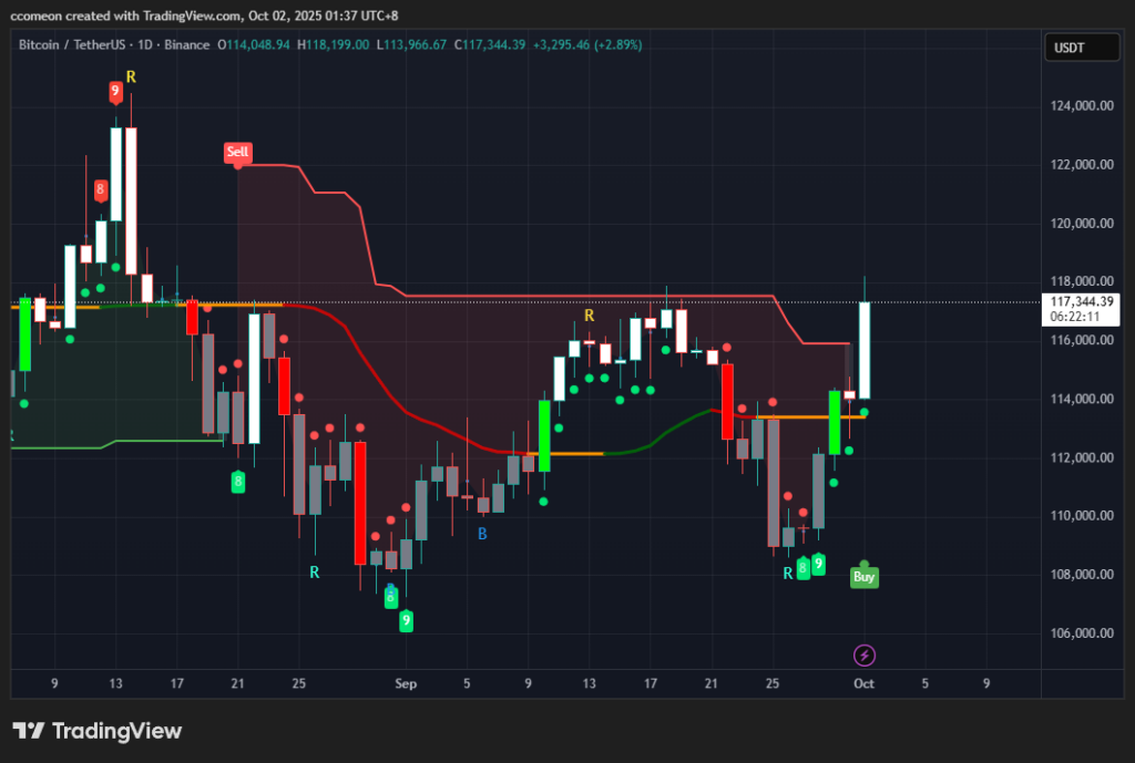 數據公布後美股和幣市都得到大幅提振,BTC 一度突破 11.8 萬、 ETH 也重回 4,300 美元水平。其實在下午比特幣似乎已經「聞風先動」,從 11.4 萬大升至 11.6 萬美元,到晚上數據公布後,直接突破 11.7 萬美元。再看看比特幣日線圖,看到幣價突破長期下行趨勢線再次走牛,如果比特幣在接下來幾天,能成功站穩在 11.6 萬至 11.7 萬美元,那就有機會一洗 8 、 9 月的頹勢,有望再挑戰新高。