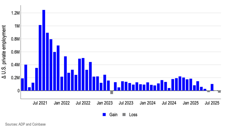 我們的觀點:政府停擺引發的數據不確定性,疊加私人部門招聘陷入停滯,使得市場對聯準會將採取限制性更低的政策路徑這一預期更趨樂觀。另外還要注意,近期多重因素共同作用,導致加密貨幣市場出現暫時性流動性缺口,具體包括:(1)美國財政部對其一般帳戶餘額的補充(目前餘額已接近目標水平,超過 8000 億美元);(2)季度末與月末資金流動;(3)新加坡 TOKEN 2049 大會帶來的「會議效應」。隨著這些影響因素的消退,短期內可望對市場價格走勢有正面推動作用。