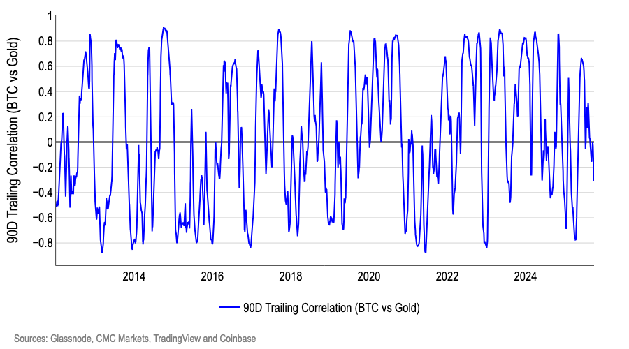 - 流動性進入黃金作為訊號:BTC 與全球流動性的相關性相對較高,而黃金則沒有表現出一致的相關性