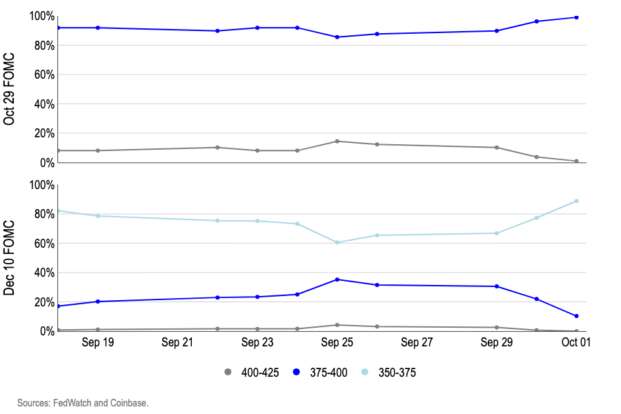 Coinbase 對 10 月份加密市場的展望在戰術層面上是看漲的:我們認為美元疲軟、短期全球流動性增加以及聯準會傾向於謹慎降息的政策傾向,將為加密貨幣市場創造有利條件。除非出現意外的鷹派言論,否則我們認為這些因素將增加 BTC 引領上漲的可能性,直至 11 月,屆時流動性逆風可能會發揮作用。