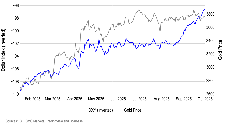 我們認為利率市場已經消化了這一轉變——30 天期聯邦基金期貨目前反映,年底前兩次降息 25 個基點的可能性為 87%——跨資產訊號也證實了實際利率下調、美元走軟的機制,這對加密貨幣有利(圖表 2)。目前,逐次 FOMC 會議定價集中在 10 月底 3.75-4.00% 的目標區間,到 12 月將趨向 3.50-3.75% 。同時,美元走弱,黃金價格創下歷史新高——這表明實際利率預期正在緩和,以及更廣泛的「保值」需求正在湧現(圖表 3)。我們認為,這種組合將放鬆美元金融環境,並降低風險資產的現金收益競爭,這應該會利好加密貨幣。