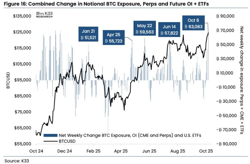 比特幣名目持倉變動(結合永續合約、期貨未平倉合約及 ETF 持倉,資料來源:K33)