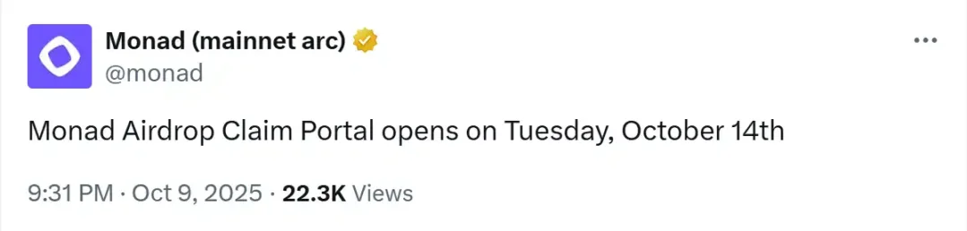 10 月 9 日,Monad 發推文宣布,空投領取門戶將於 10 月 14 日(星期二)開放。