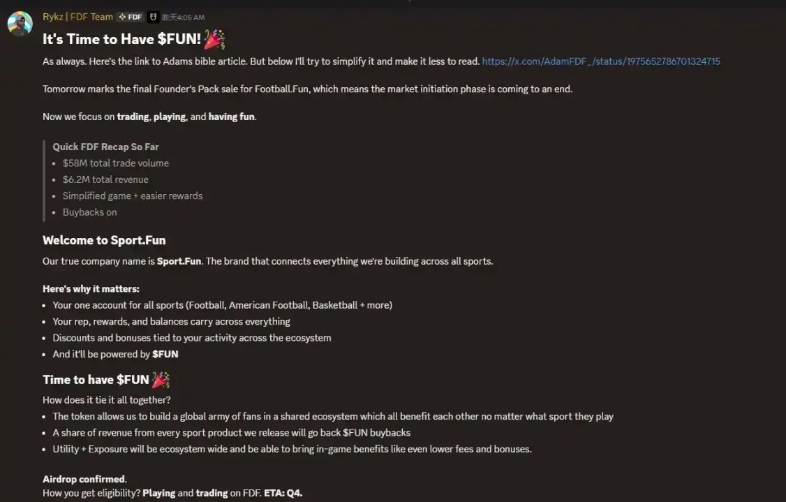 10 月 9 日,根據 Base 鏈上體育預測應用 Football.Fun 官方消息,其母公司 Sport.Fun 將於 Q4 推出代幣 $FUN 並預計將在 Q4 進行空投,該代幣將享受公司旗下預測市場收益分成。