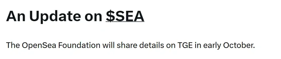 9 月 9 日,OpenSea CMO Adam Hollander 在發表在 Twitter 上的文章中透露,OpenSea 基金會將在 10 月初發布 TGE 的具體細節。