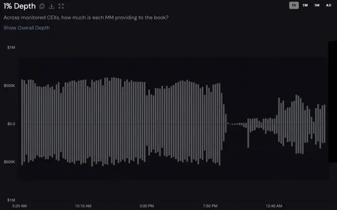 香港時間 5:00:關鍵轉折點。美國市場開盤之際,宏觀環境急劇惡化。機構參與者撤出流動性,買賣價差大幅擴大,訂單簿深度驟減。做市商正是在此時從防禦性部位調整轉為全面撤離。