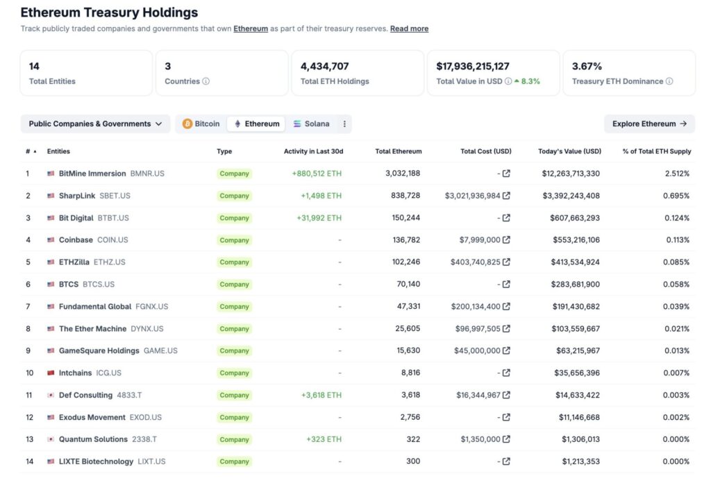 據 coingecko 數據,目前主要實體——包括上市企業、政府實體——持有超過 440 萬枚 ETH,價值接近 180 億美元,佔以太坊總供應量的 3.67% 。當中尤以 BitMine 引領了這一趨勢,僅 BitMine 一家就持有超過 300 萬枚以太幣,並目標控制全球以太幣供應量的 5% 。
