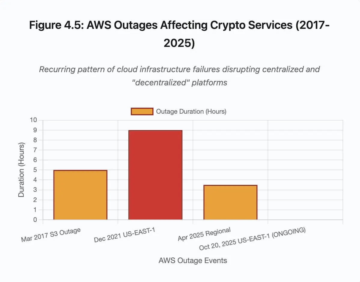 這些交易所將關鍵組件託管在 AWS 基礎設施上。當 AWS 經歷區域性中斷時,多個主要交易所和服務會同時變得不可用。在中斷期間——恰恰是市場波動可能需要立即採取行動的時候——用戶無法存取資金、執行交易或修改頭寸。