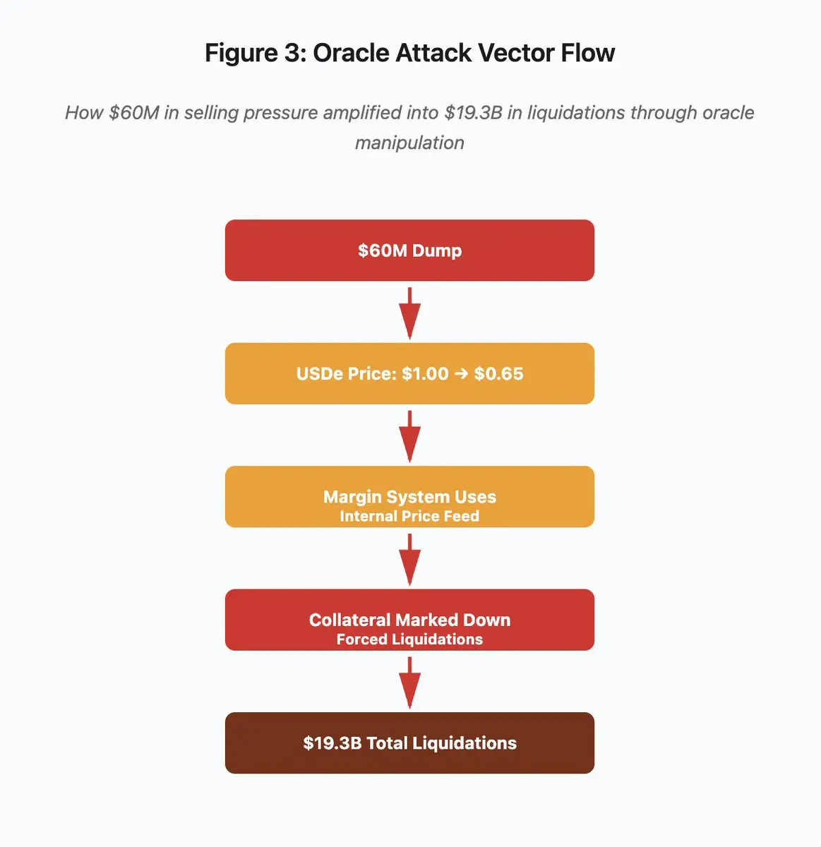 這次攻擊利用了幣安使用現貨市場價格來為封裝的合成抵押品定價的機制。當一名攻擊者將價值 6000 萬美元的 USDe 拋售到流動性相對稀薄的訂單簿中時,現貨價格從 1.00 美元暴跌至 0.65 美元。被配置為以現貨價格標記抵押品的保證金系統,將所有以 USDe 為抵押品的部位價值下調了 35% 。這引發了追加保證金通知和數千個帳戶的強制清算。