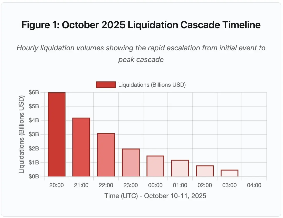 這場發生於 2025 年 10 月 10 日至 11 日的清算連鎖事件,成為基礎設施失效機制的典型案例。 UTC 時間 10 月 10 日 20:00(香港時間 10 月 11 日 4:00),一項重大地緣政治公告引發市場普遍拋售。短短一小時內,清算規模高達 60 億美元。當亞洲市場開盤時,槓桿部位的整體蒸發額已達 193 億美元,波及 160 萬名交易者帳戶。