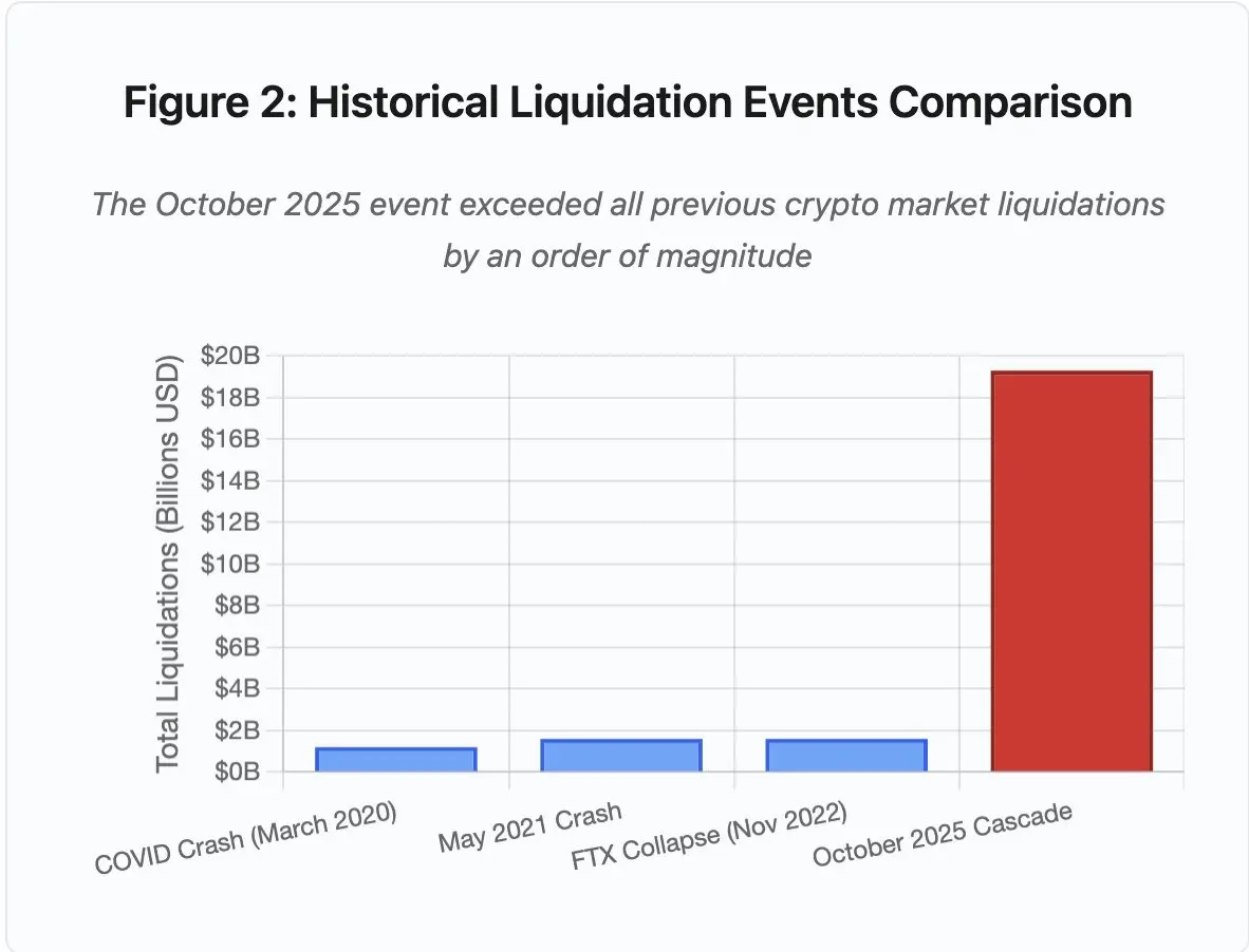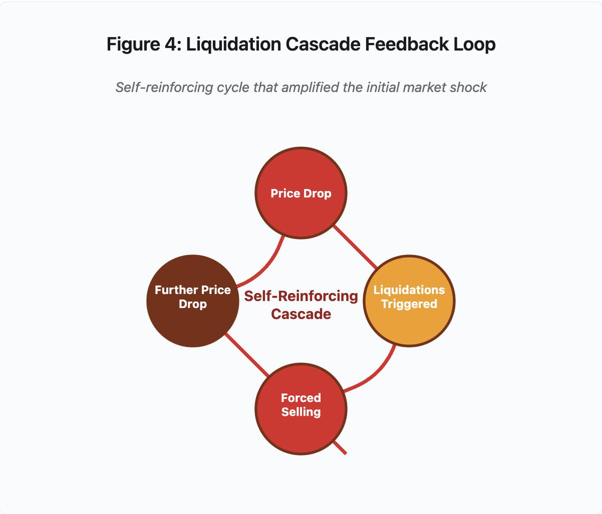 這些清算迫使更多賣單進入同一個缺乏流動性的市場,進一步壓低了價格。保證金系統觀察到這些更低的價格,並減記了更多的部位。這個回饋循環將 6000 萬美元的賣壓放大了 322 倍,最終導致了 193 億美元的強制清算。
