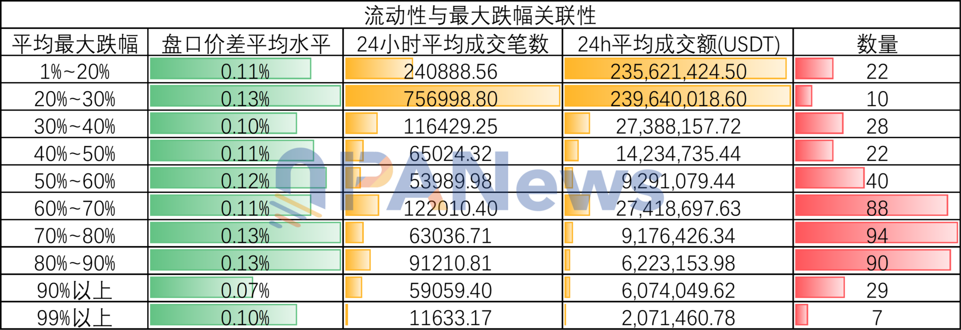 為了驗證流動性與 10 月 11 日暴跌之間有無直接關聯,PANews 對於這些代幣的流動性數據進行了進一步分析。以盤口價差為例,10 月 11 日當日跌幅小於 20% 的代幣平均的盤口價格差約為 0.11%,而當日最大跌幅在 70%~80% 代幣的盤出價差的平均值則為 0.13% 左右。