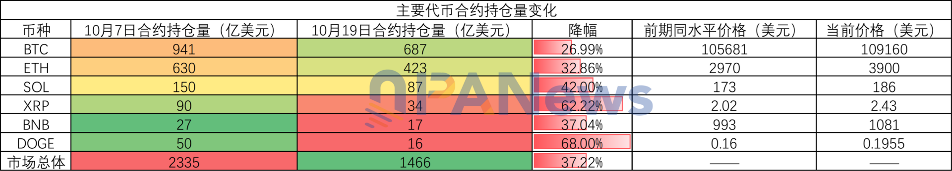 首先從合約的持倉量來看,市場總體的合約持股量隨著這場暴跌出現了大幅下降,根據 Coinglass 的數據顯示,10 月 8 日,市場的未平倉合約總量達到了歷史高點 2335 億美元,而到了 10 月 19 日,這一數據下降至 1466 億美元,降幅達到了 37% 。