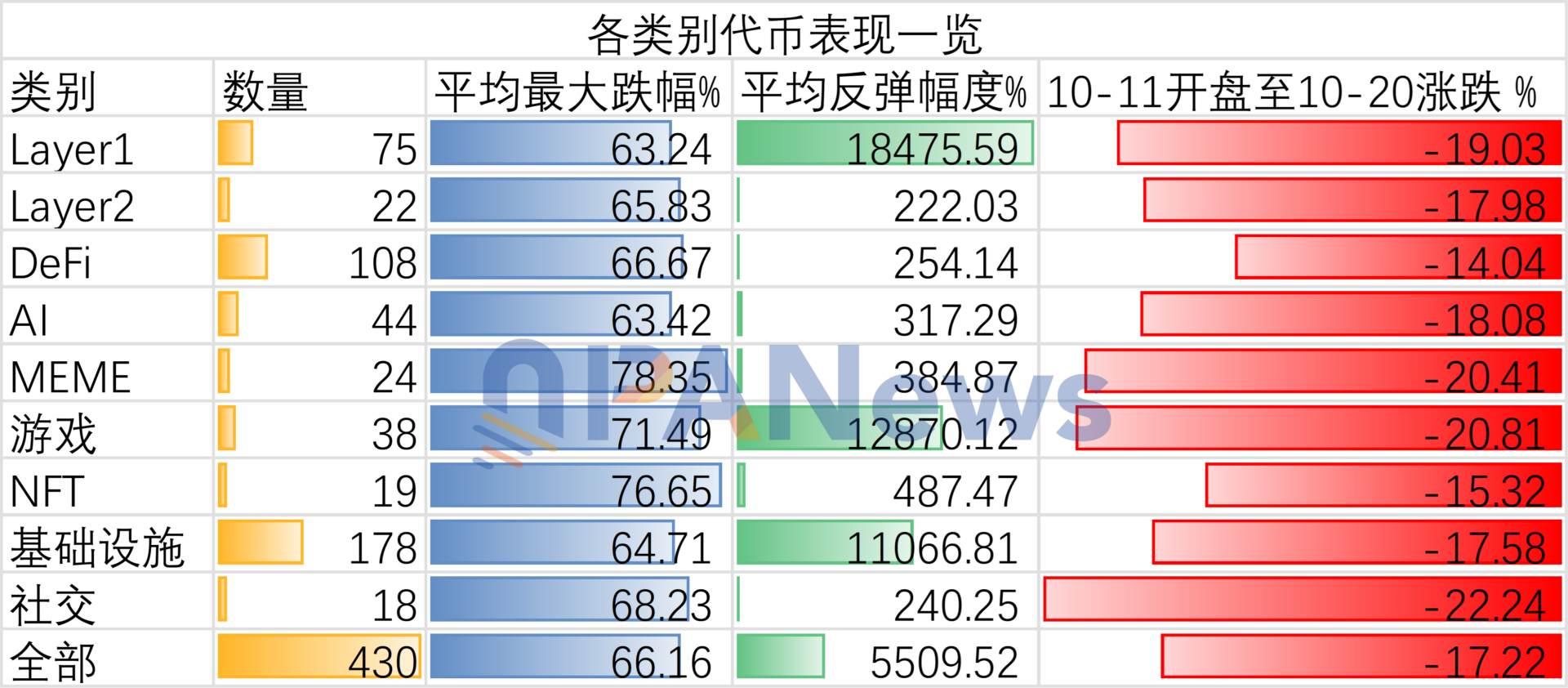 在巨大的瞬時跌幅之後,由於許多代幣的價格短時間內都創造了一個極低的記錄,這也讓隨後的反彈顯得格外誇張。例如,IOTX 的低點反彈力道達到了 1230900%(最低點達到了 0.000001)。此外,像 ENJ 、 ATOM 、 ANKR 等幾個代幣的最大反彈都超過了千倍。而超過 10 倍的反彈代幣也達到了 22 個,這也使得最低點反彈數據看起來有些脫離真實。根據 PANews 統計,自 10 月 11 日低點至 10 月 20 日收盤時,所有代幣的平均反彈力度達到了 5509% 。