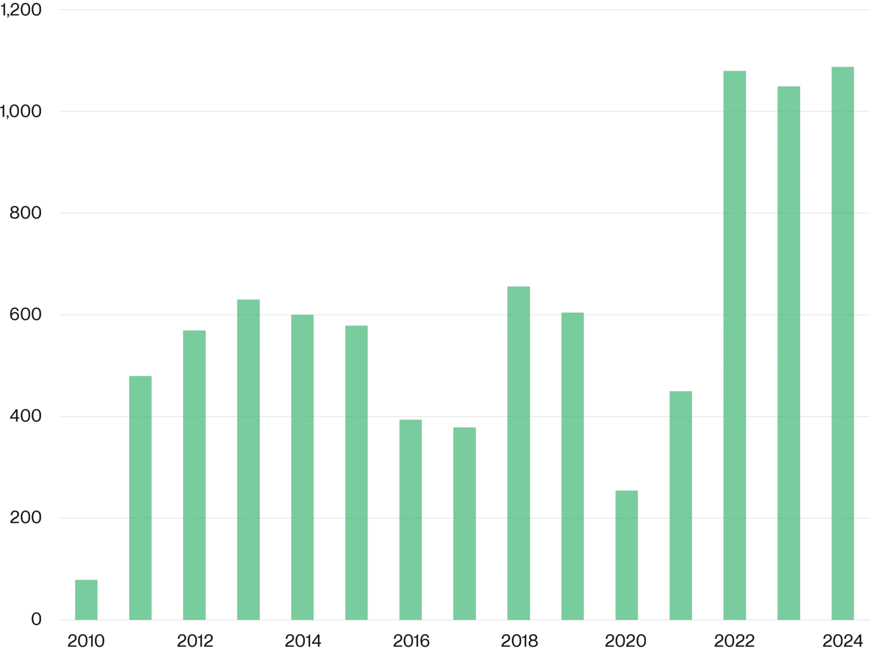 請看下方表格,該表格展示了 2010 年至 2024 年各國央行的年度黃金購買量。 2021 年央行購金量為 467 噸,2022 年躍升至 1,080 噸,此後一直維持在此高位(預測顯示 2025 年的需求將略低於 2024 年)。