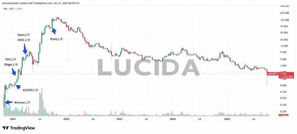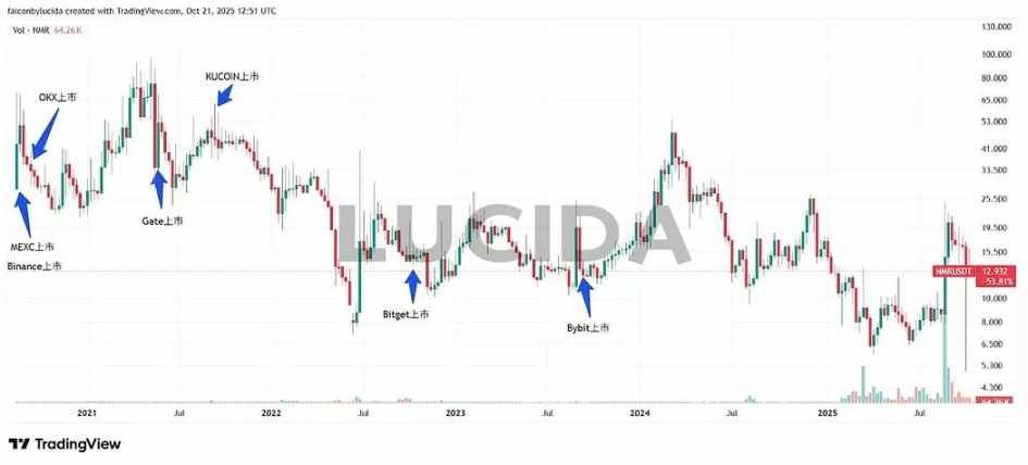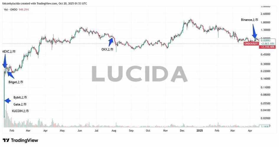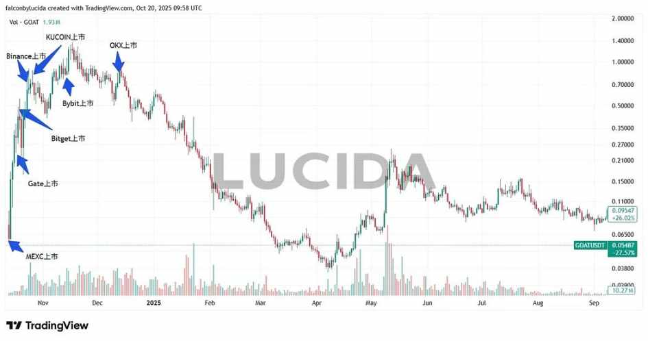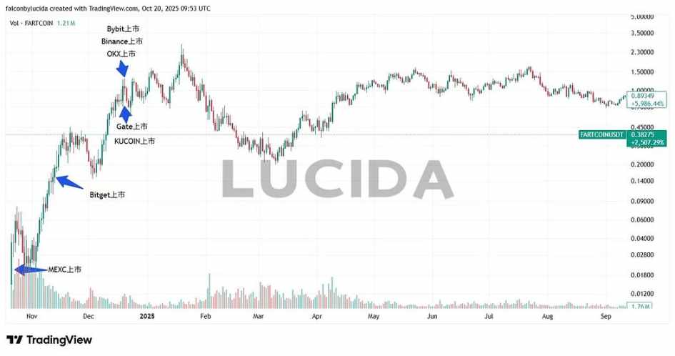 首發於 MEXC 和 Binance,下跌後開啟長牛。 Gate 上線在階段性高點,Bitget 上線於低位平台後迎來上漲,KuCoin 上線後即回調,而 Bybit 和 OKX 則在新一輪行情爆發前精準佈局。