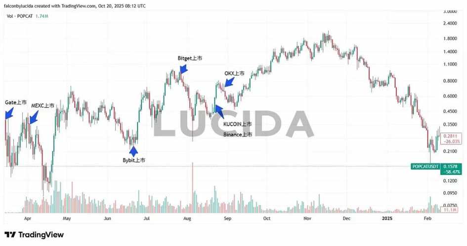 以 PEPE 、 POPCAT 、 FARTCOIN 為代表,Meme 幣的生命週期極短,上市速度直接決定收益。 MEXC 和 Gate 持續扮演「Meme 首發站」角色,幾乎包辦了所有早期明星 Meme 幣的首發。 OKX 和 Binance 雖然上市較晚,但憑藉龐大的用戶基礎,仍能推動幣價進入第二波主升浪。