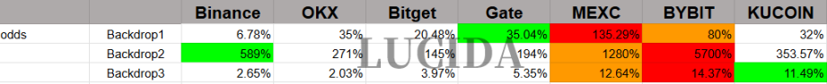 從數據中可以明顯看到,在三個觀察週期中,MEXC 和 Bybit 的賠率表現穩居第一梯隊。換句話說,在這裡,你更有機會用更少的「試錯成本」,捕捉到那些一飛沖天的標的。