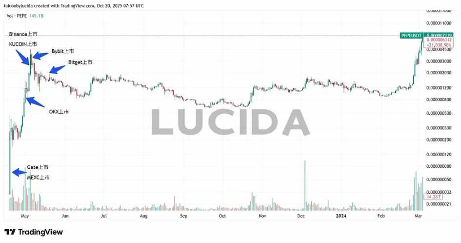 MEXC 首發,並在上漲途中獲 Gate 、 Bitget 、 Binance 、 KuCoin 陸續上線。當 Bybit 和 OKX 上線時,盛宴已近散場。