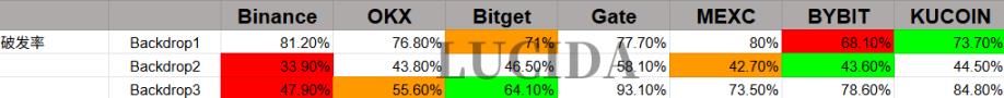 結果顯示,Binance 在控制破發率上展現了老大哥的穩健,通常保持最低。 Bitget 與 Bybit 同樣表現可靠。而 Gate 在三次評比中均未進入前三,需要打新的你多一份警惕。