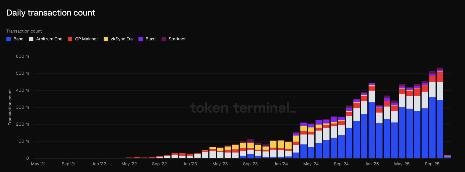 根據 Token Terminal 最新數據,以太坊 Layer2 網路的月交易量持續強勁成長,今年 10 月總計完成超過 5.3 億筆交易,創下歷史新高,是同期主網(4800 萬筆)的 11 倍左右。在各 L2 網路中,Base 以絕對優勢貢獻 64.2% 的交易量(約 3.4 億筆),成為生態中最活躍的鏈,其交易激增或受到發幣項目的刺激。其次是 Arbitrum One 和 OP Mainnet,交易佔比分別約為 15% 和 12% 。