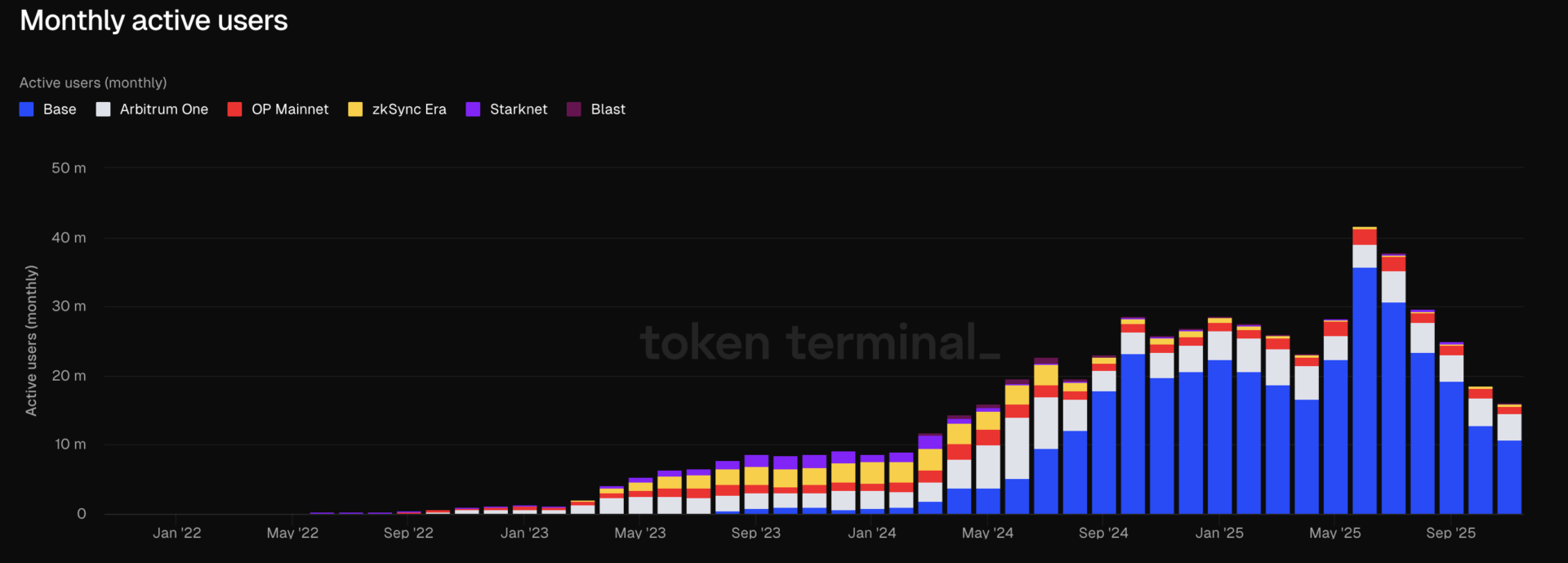 從每月活躍用戶數據來看,L2 網路在 10 月呈現下滑與分化加劇的趨勢。 Token Terminal 最新數據顯示,L2 月活躍用戶達 1,610 萬個,較今年 6 月的歷史高峰 4,170 萬個下滑了 61.4%,但遠超過以太坊主網的 830 萬個。其中,Base 仍維持絕對領先,佔比 22.9%,表現相對穩定;zkSync Era 、 Starknet 和 Blast 等其他鏈用戶流失較歷史高峰也較為明顯。