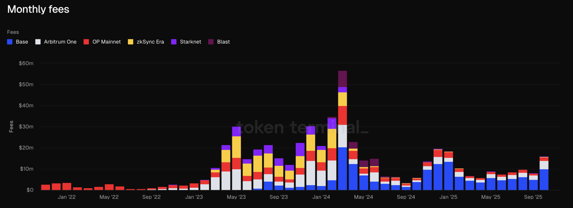 而 L2 網路的費用在近期也出現顯著回暖。從每日手續費收入(Fees)來看,自 2024 年 5 月達到歷史高峰超 5.6 億萬美元後,L2 板塊整體呈現斷崖式下滑趨勢。儘管期間 Dencun 升級大幅降低了數據成本、更多 L2 項目擴容上線,但手續費收入並未因此回暖,反而因鏈上活動退潮、 Gas 敘事降溫以及生態兌現不及預期等多重因素而加速萎縮。到 2025 年 10 月,整個 L2 板塊的月度手續費接近 1.6 億美元,僅為高峰的 28.1%,但創下今年 2 月以來新高。其中,Base 、 Arbitrum One 、 OP Mainnet 三者佔了總手續費的約 98.3% 。