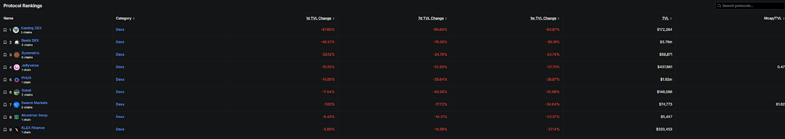 根據 Defillama 的數據顯示,在攻擊發生後,Balancer 的 TVL 直接從 7.76 億美元下降至 3.45 億美元,降幅超過一半。尤其是 Balancer V2 的 TVL 直接減少了 2.3 億美元,Balancer V2 的分叉協議也紛紛撤出資金池,其中 Gaming DEX 的 TVL 在一天內下降了 87%,Beets DEX 則下降了 48% 。