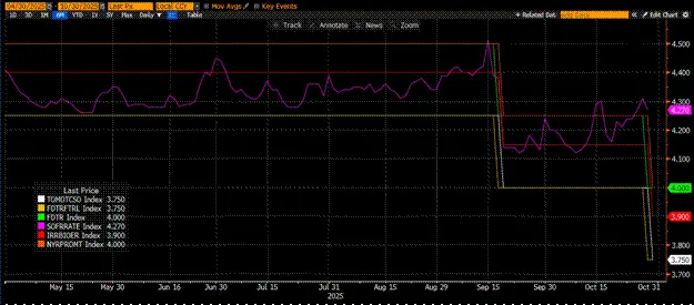 聯準會有兩個政策利率:聯邦基金利率的上限(Upper Fed Funds)和下限(Lower Fed Funds);目前分別為 4.00% 和 3.75% 。為了將實際短期利率(SOFR,即擔保隔夜融資利率)強制維持在這個區間內,聯準會使用了以下工具(按利率從低到高排序):