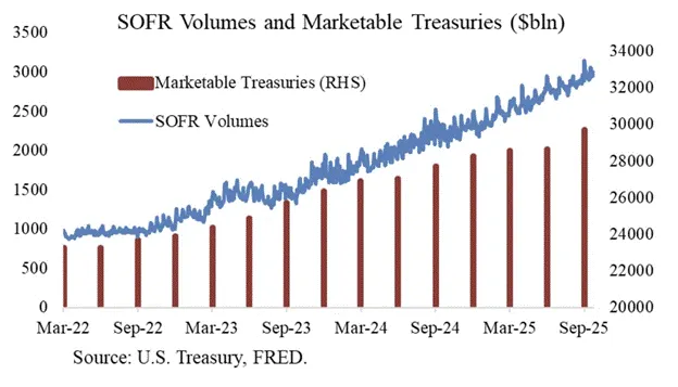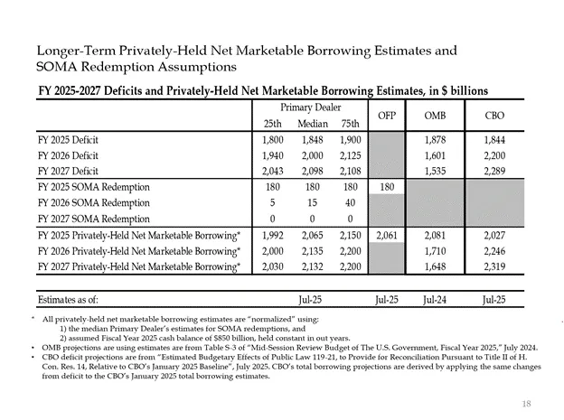 這只能爭取一些時間。但最終,國債發行的指數級擴張將迫使 SRF 被重複使用。記住,財政部長 Buffalo Bill Bessent 不僅需要每年發行 2 兆美元來資助政府,還需要發行數萬億美元來展期(roll over)到期債務。