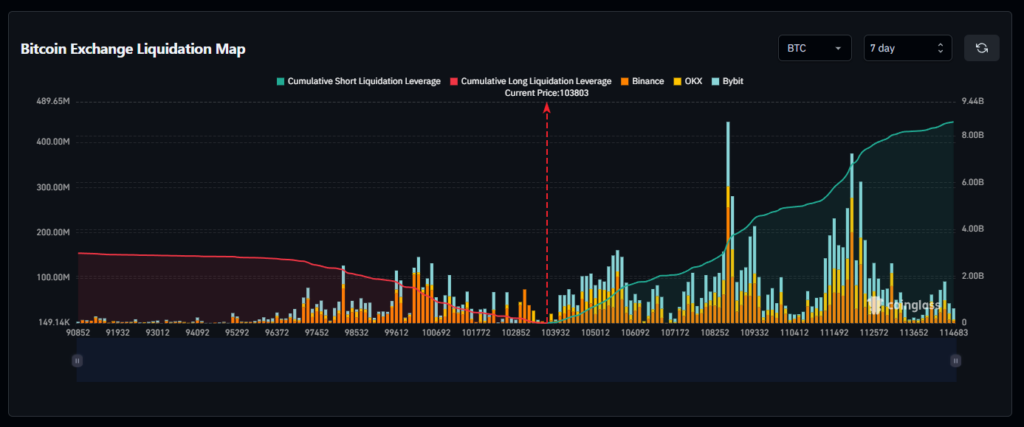 再回來看看清算地圖,由於 1 日圖表的流動性顯示太低(都爆倉了沒人敢開單),所以放大看近一週的倉位,可以看出空頭的數量明顯很多,以最近市場走勢和情緒來看這是必然,而以目前形勢只要 BTC 能漲到 10.86 萬美元,就能清算近 30 億美元的倉位,數量相當驚人,同時也可以看到多倉數量明顯減少了很多,所以如果美國那邊情況有改善,大概率我們可以看到市場反彈幅度會更大。