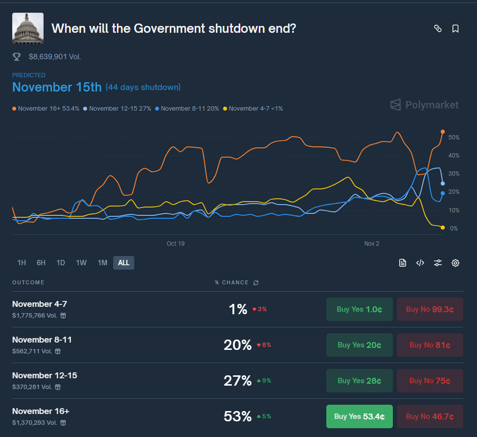 從預測市場 Polymarket 的比例來看,昨天在 16 號前結束停擺一度跌至 30% 以下,到昨天晚上又再超過 50%,可見市場對於短期內結束的期望再度落空。目前幣圈情緒已經到達到熊市的程度,所以任何利空都會讓投資者迅速避險,加上流動性枯竭,市場流動性承接力不足,如果出現瞬間下跌將會造成更深的回調。
