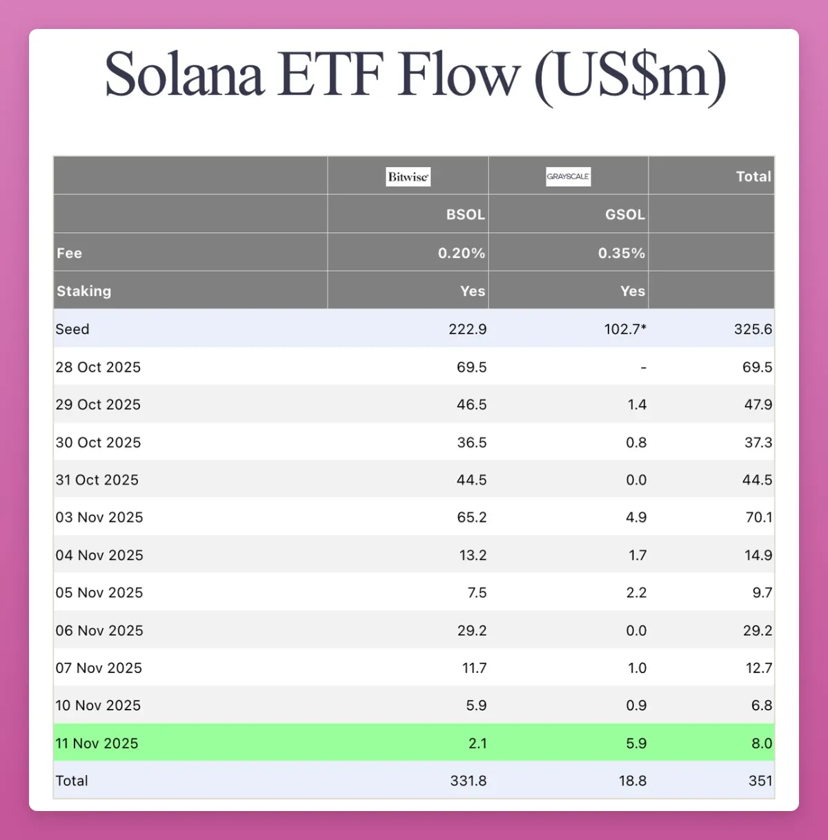 SOL 正進入與 ETH 相同的機構化階段。上個月,CT 上出現了 SOL 現貨 ETF,而且沒有任何炒作。資金流入量雖然不是特別高(總計 3.51 億美元),但每天都有正流入。
