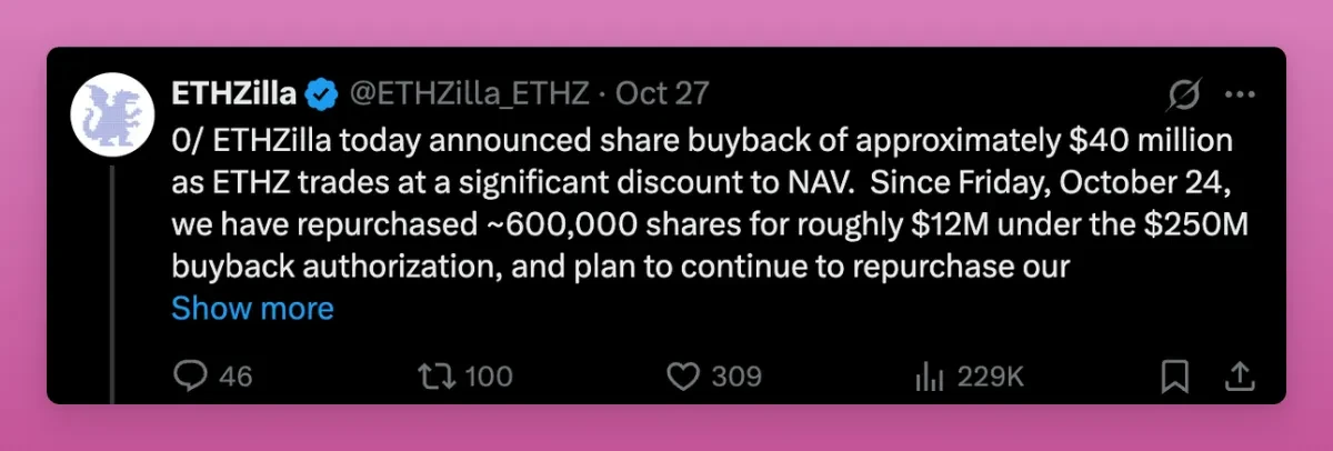 ETF+DAT 的組合使 ETH 持有者群體更加機構化,但尚不清楚他們是否更傾向於長期成長。主要的擔憂點是 ETHZilla 宣佈出售 ETH 以回購其股份。這並非恐慌的理由,但已樹立了先例。