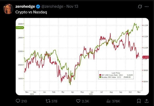 另一個在網路上被廣泛討論的議題,是著名博客 Zerohedge 分享的這張圖,綠色線是納斯達克指數、紅色是比特幣的價格,可以看到比特幣的價格表現,在近兩個月已經跑輸納斯達克。而大家討論的重點,是這個走勢有點像比特幣在 2021 年 11 月創新高時的情況,比特幣觸及當時新高 69,000 美元,然後開始跑輸納斯達克,然後納斯達克也開始下跌,帶著比特幣下探 20,000 美元,歷史會否重演?