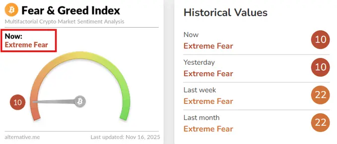 這也解釋了市場情緒的突然轉變。加密貨幣市場恐懼與貪婪指數已正式跌至 10,即「極端恐懼」。