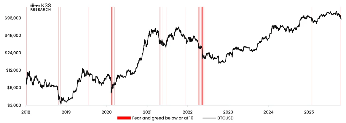K33 估計,若依循過去兩年最深跌幅的軌跡,比特幣潛在底部可能落在 84,000 至 86,000 美元區間;若賣壓進一步加劇,甚至可能再度下探 4 月低點,逼近 Strategy 的比特幣平均持倉成本 74,433 美元。 Vetle Lunde 強調: