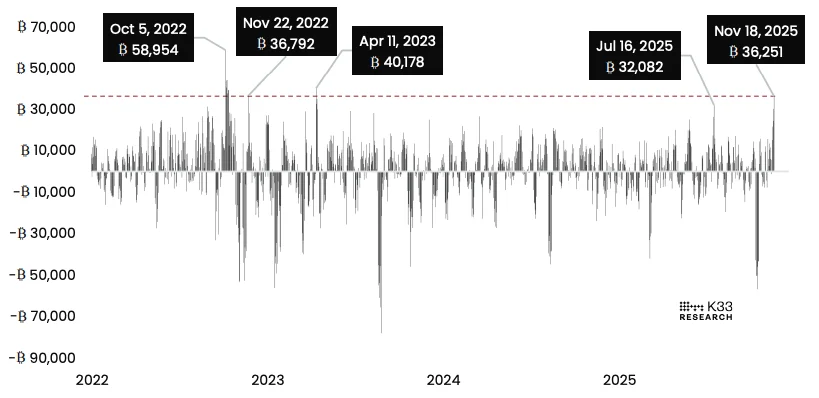 除了永續合約市場的未爆彈,比特幣現貨 ETF 的拋售潮也未見停歇。 K33 報告指出,過去一周 ETF 淨流出逾 2 萬枚比特幣,過去 30 天更累計失血近 4 萬枚比特幣。