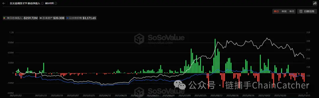首先,以太幣相關 ETF 的資金流入趨勢明顯放緩。目前 ETF 總持股約為 635.86 萬枚 ETH,佔總供應量的 5.25% 。根據 SoSoValue 數據,截至 11 月中旬,以太幣現貨 ETF 總淨資產約 187.6 億美元,本月淨流出已顯著超過流入,單日資金流出量高達 1.8 億美元。與 7 月至 8 月持續淨流入的階段相比,資金曲線已從平穩上升為震盪下行。