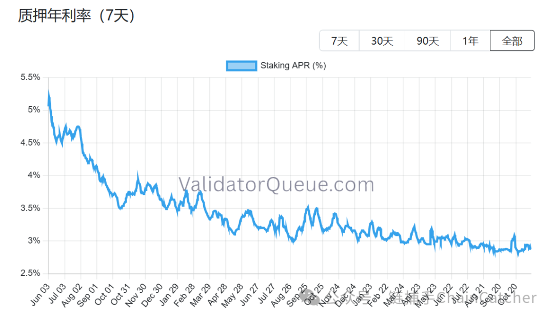 二是質押殖利率下降和借貸成本上升,使得槓桿質押無利可圖。目前以太幣的年化質押收益率約為 2.9% APR,遠低於 2023 年 5 月創下的 8.6% 的歷史最高紀錄。