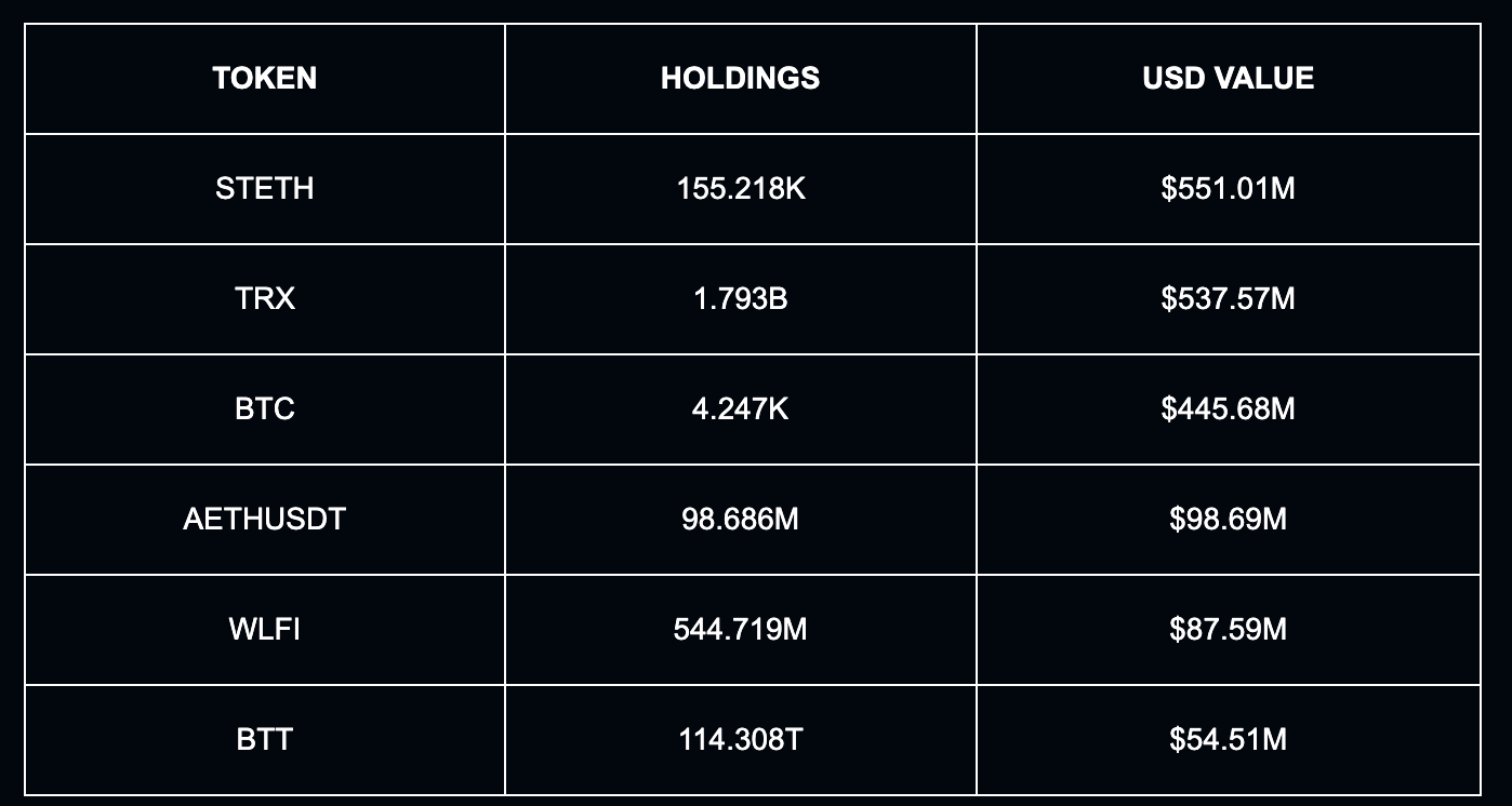 根據 Arkham 數據,孫宇晨的鏈上財富約 19 億美元。然而,Arkham 估算孫宇晨的淨資產在 50 億至 60 億美元之間,他持有多種加密貨幣資產。
