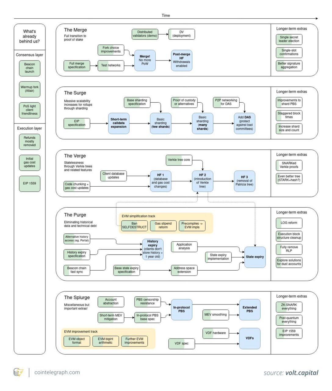 這些升級與 Vitalik Buterin 簡略的路線圖相符:Merge 、 Surge 、 Verge 、 Purge 和 Splurge 。 Surge 旨在透過 Rollup 和更好的資料可用性來擴展以太坊,而 Verge 和 Purge 則專注於更輕量級的用戶端和清除舊的歷史紀錄。