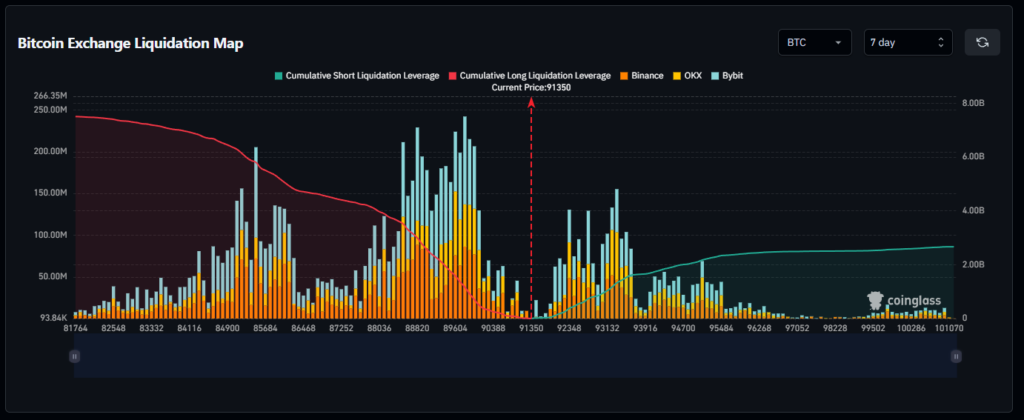 上週 BTC 從 8 萬反彈回 9 萬水平,上週也分析過,91,000 美元成了 BTC 牛熊分界線,所以週末 BTC 價格也反覆在測試 91,000 這個價位,由於接近月底所以市場也沒有很大的動靜。但由於上週幣市稍為回溫,所以市場情緒一下子回來了,從一週清算地圖來看,目前多頭倉位也比較密集,但這也是一個值得警惕的訊號,因為如果多頭集中,那向下清算的機會會增多。