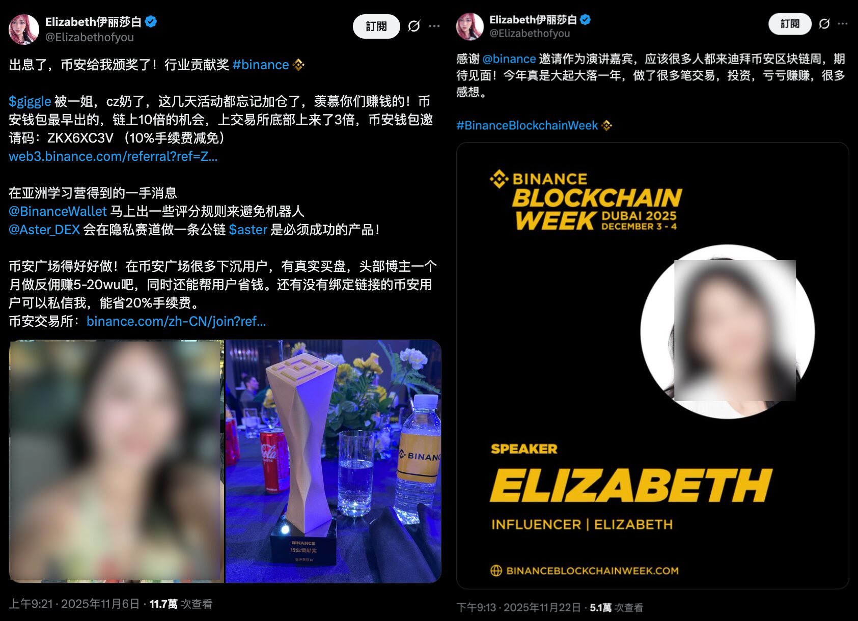 值得注意的是,伊麗莎白曾在幣安舉辦的頒獎活動中獲得「最佳行業貢獻者」獎項,與其它知名加密圈創作者並列。更被幣安邀請至明後天的幣安區塊鏈週擔任演講嘉賓。此背景讓不少網友更難接受她在災難事件上疑似「假捐款、真吸粉」。