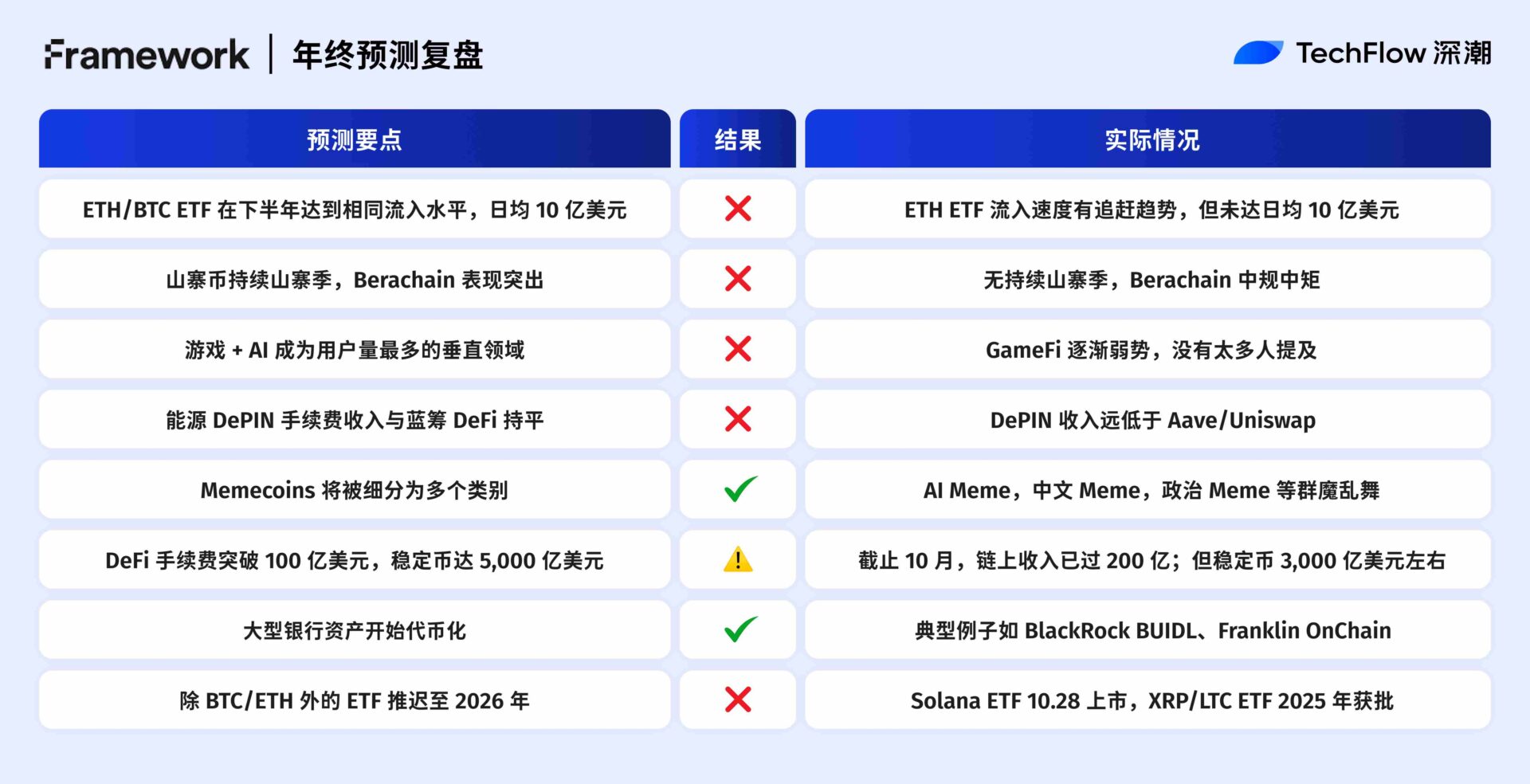 價格目標全部落空:BTC ETH 和 SOL 的預測價格遠高於今年這些代幣的實際表現。 Coinbase 股價 $250,距離 $700 目標差 65% 。 RWA 代幣化預估 500 億美金,顯然也屬於高估。