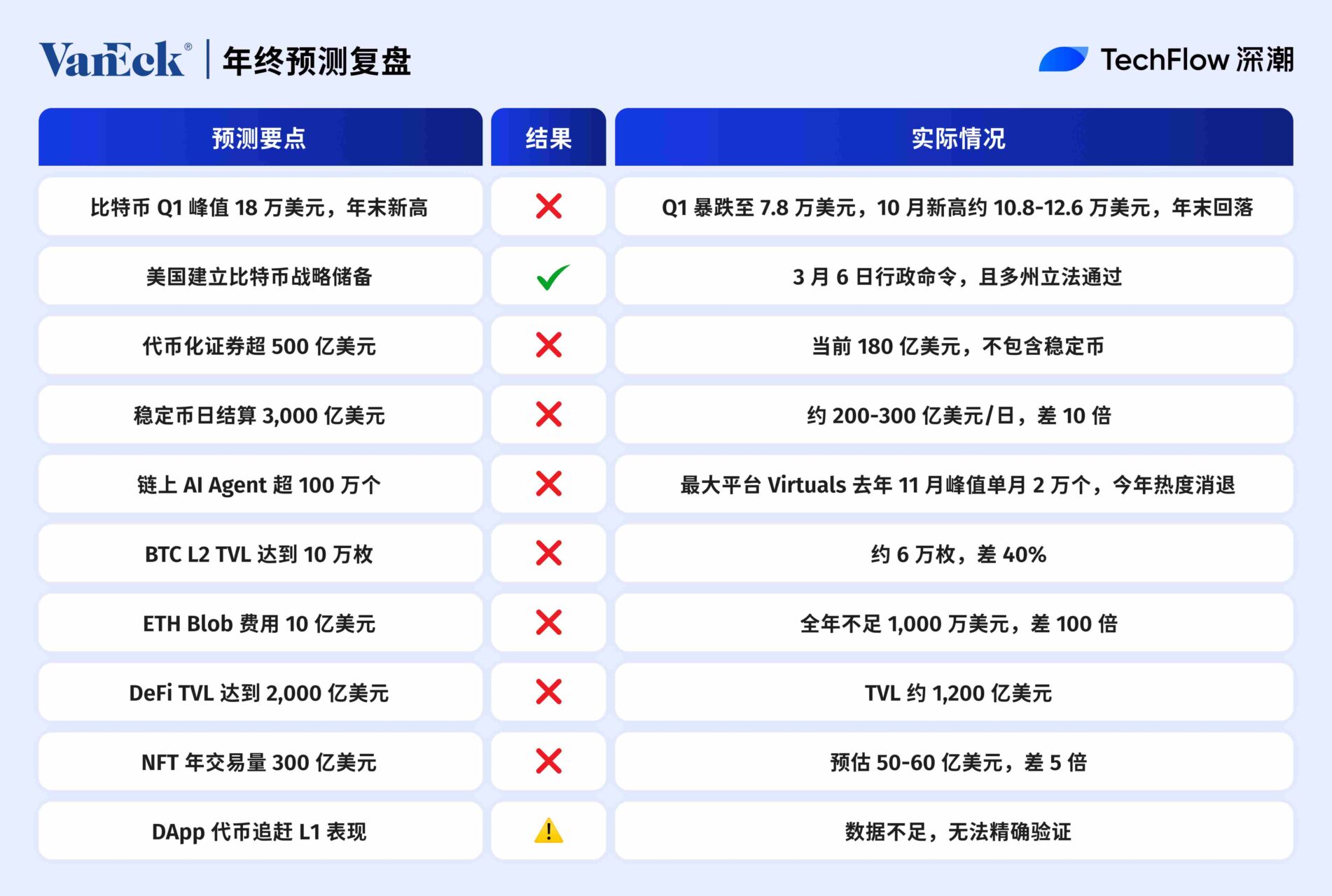 其餘 9 個全部落空,且多數不是小幅偏差,而是數量級錯誤,例如預測加密 Q1 見頂且比特幣達到 $180k 、年末再創新高;實際上時間節奏和價格目標完全相反。