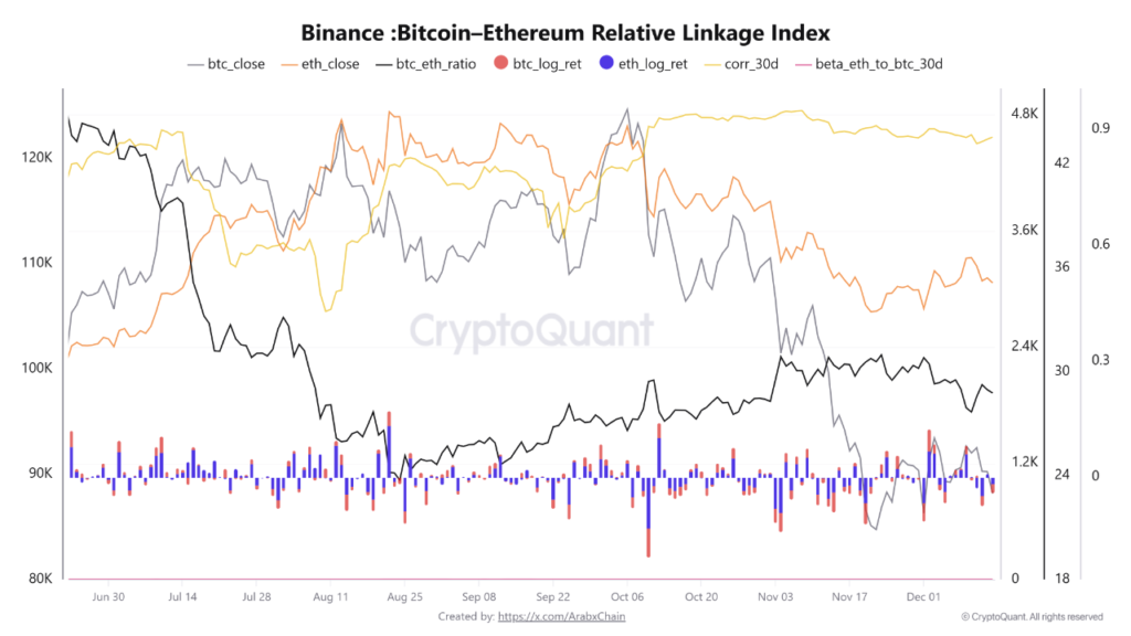 根據 Arab Chain 分析,幣安數據顯示,從收益角度來看,比特幣和以太幣每日對數收益率(logarithmic returns)均為負數。目前,比特幣交易價格接近 8.7 萬美元水平,而以太幣則在 3,000 美元左右徘徊,然而,比特幣的跌幅較以太幣更為顯著,導致短期動能明顯下滑,這種走勢反映了,在經歷一段強勁漲勢後出現的自然盤整階段,但並不一定代表長期下行趨勢的開始。