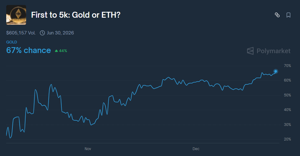 然後來討論比較有趣的題目,根據預測市場 Polymarket 最新數據,黃金在 2026 年 6 月底前達到每盎司 5,000 美元的機率已升至 67%,高於 ETH 同期達到 5,000 美元的機率。目前黃金價格已經突破 4,400 美元,加上目前全球政治經濟風險升溫,造就了這個趨勢。反之,ETH 還在努力守住 3,000 美元防線,但熊市氣氛濃烈的悲觀情緒下,再次跌破只是時間問題,這凸顯加密貨幣實際上被視為風險資產。
